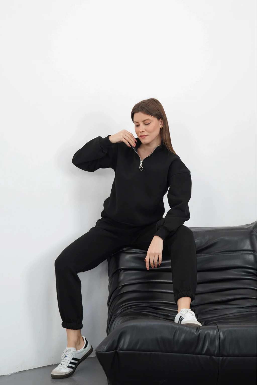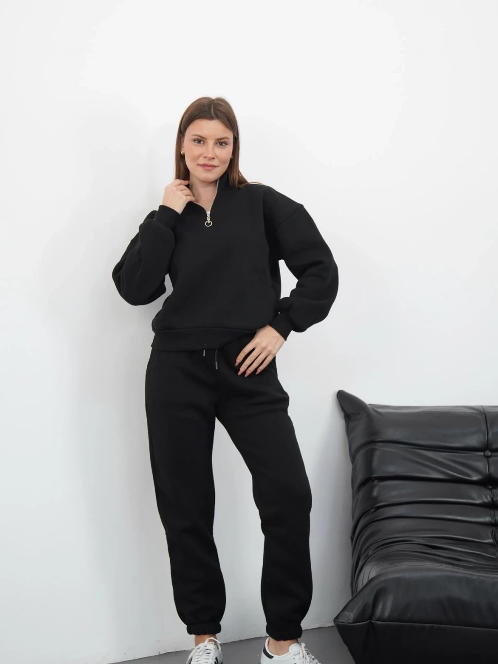 Şık ve modern bir görünüm elde etmek isteyen kadınlar için ideal olan şardonlu yarım fermuarlı alt üst takım siyah, gardırobunuzun vazgeçilmez parçalarından biri olmaya aday. Hem günlük hayatta hem de özel davetlerde rahatlıkla tercih edebileceğiniz bu takım, hem şıklığı hem de konforu bir arada sunuyor.