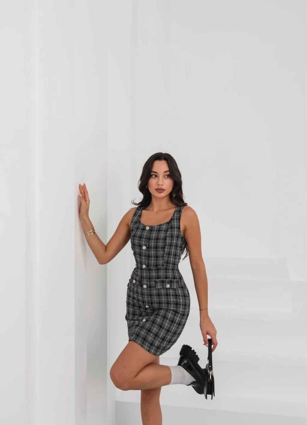 Askılı CH kumaş düğmeli elbise siyahbeyaz h265007, şıklığı ve rahatlığı bir arada sunar.